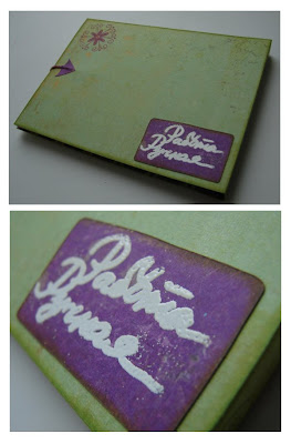 Кстати, задняя обложка тоже немного облагорожена: тот же цветочный штамп и подпись, выполненная посредством влажного эмбоссинга белой пудрой Ranger (Seafoam White).